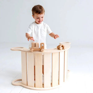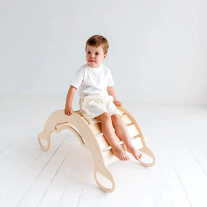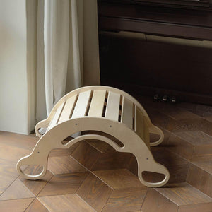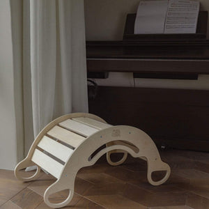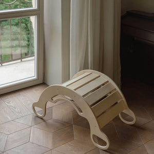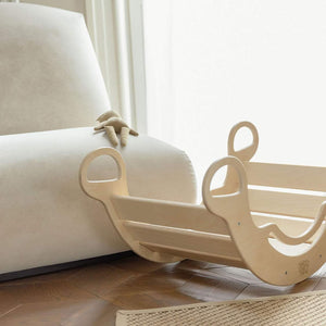 Aibambini e alle bambine a partire da 1 anno di età. Non serve solo per dondolarsi, che è utile per rafforzare i muscoli addominali. L'altalena in legno può anche trasformarsi in una struttura per arrampicarsi , in un bancone da negozio, in un nascondiglio o in uno scivolo semplicemente girandola. Per i bambini più piccoli, l'altalena è dotata di maniglie laterali più piccole oltre a quelle superiori per garantire la stabilità. Poiché l'altalena ha una capacità di carico di 110 kg , può essere utilizzata anche come seggiolino per bambini più grandi o adulti.